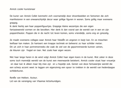 Publicatie omtrent mijn tentoonstelling in Galerij Walden te Ekeren waar ook anderen exposeren. Op de foto staan ik en Renée van Hekken. De poppenschilderijen zijn mijn werk.
